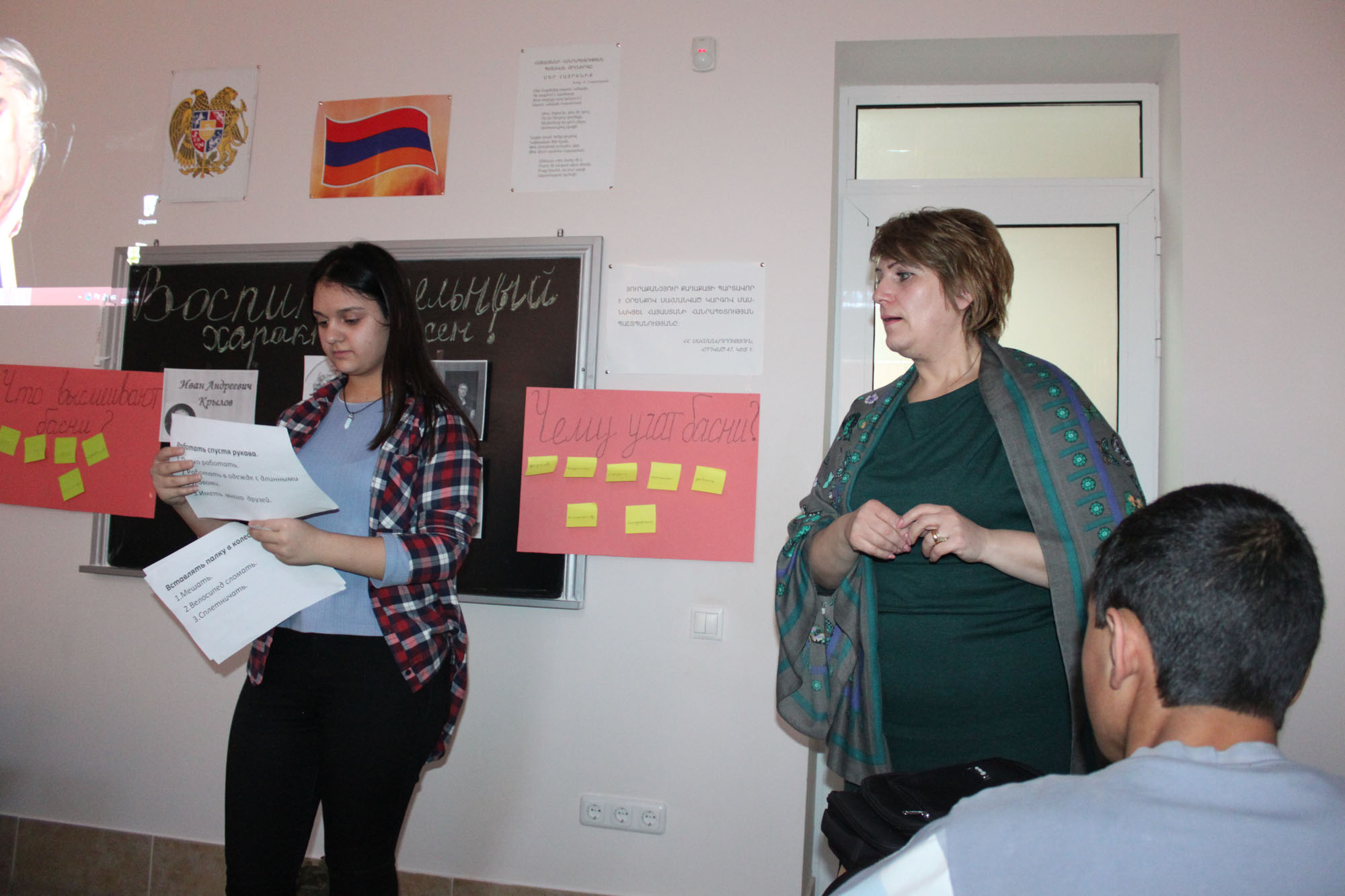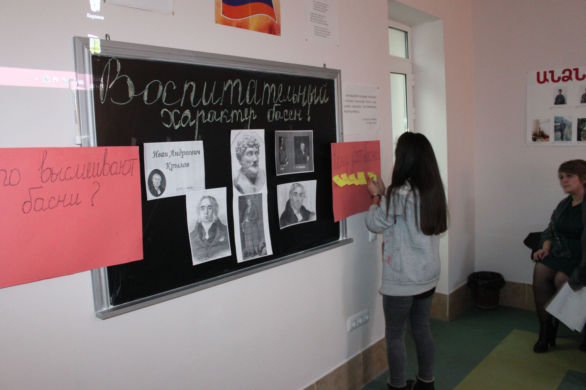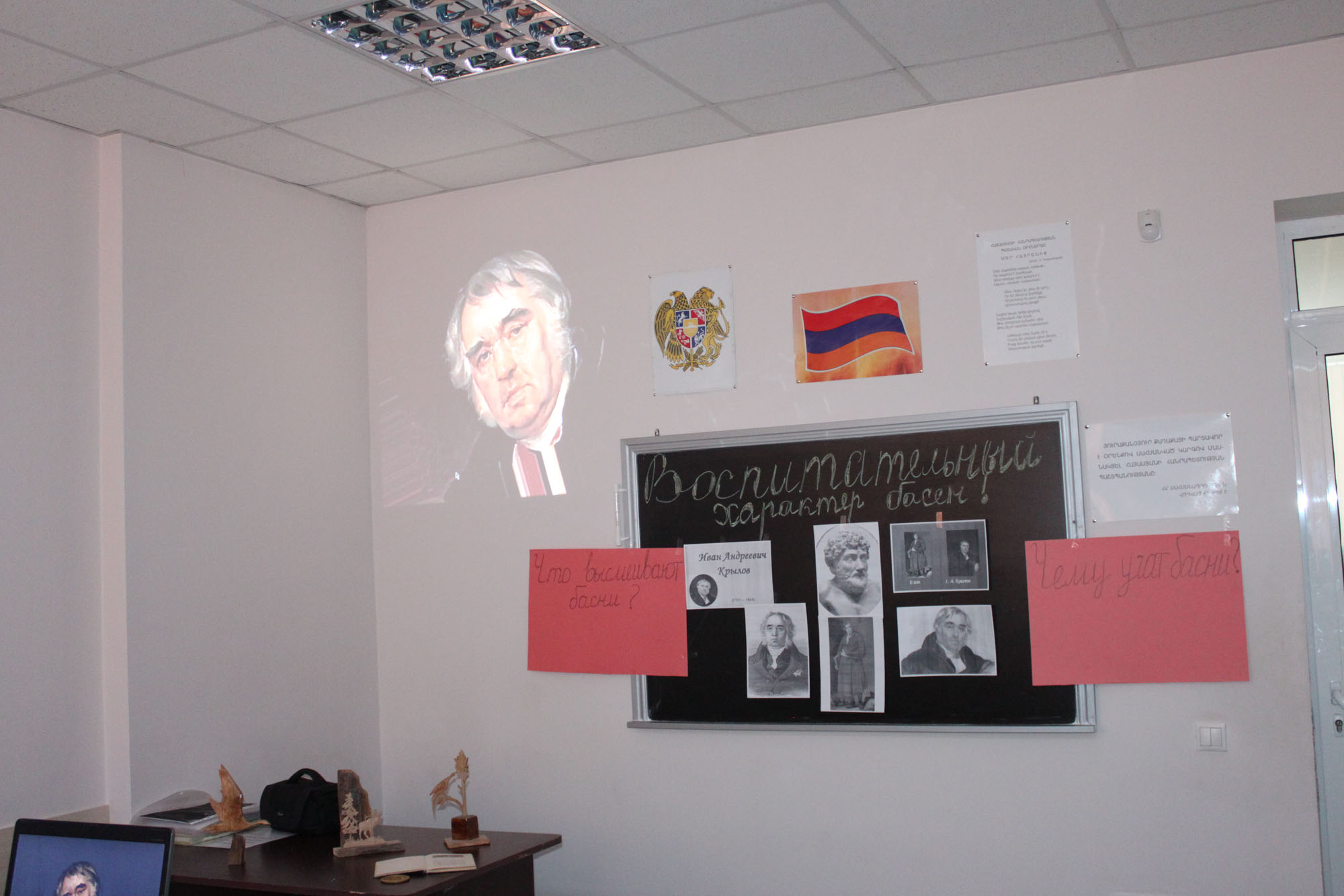 The lesson began with the preface of the teacher, then the students presented the biography of Krylov, talked about his works, presented the parable as a literary genre. Then they read from the parables of Krylov, commenting on them, noting that human flaws, wickedness, greed, flattery and so on are criticized in parables. The students took comparisons between the world and the Armenian scribes, Jeshophos, Gosh, and Aygektsi.