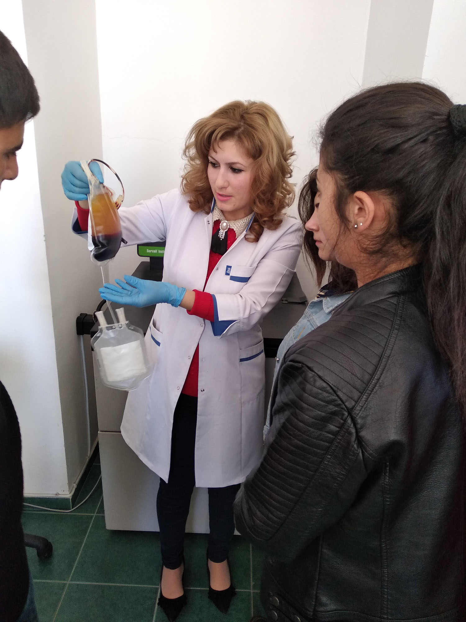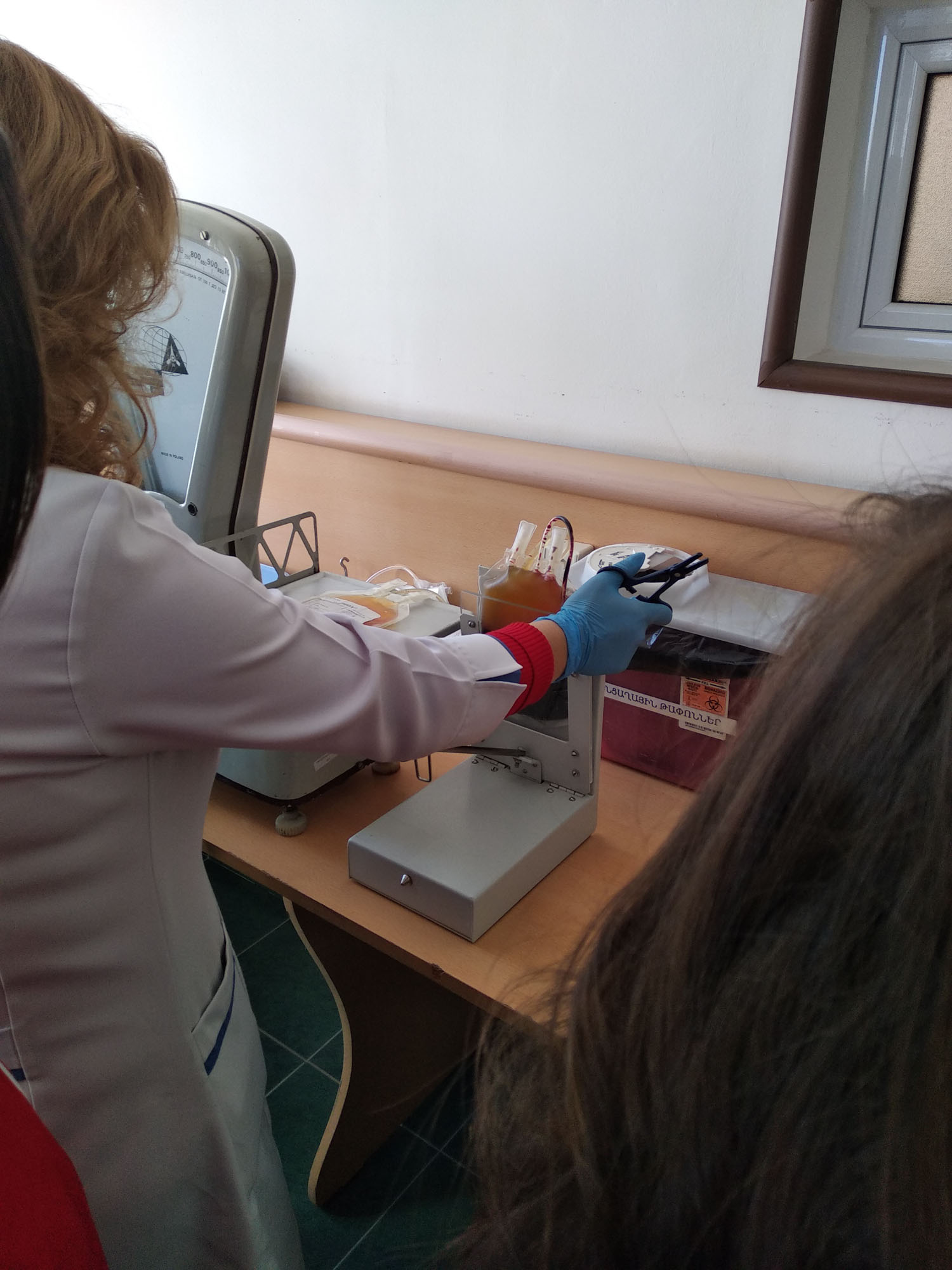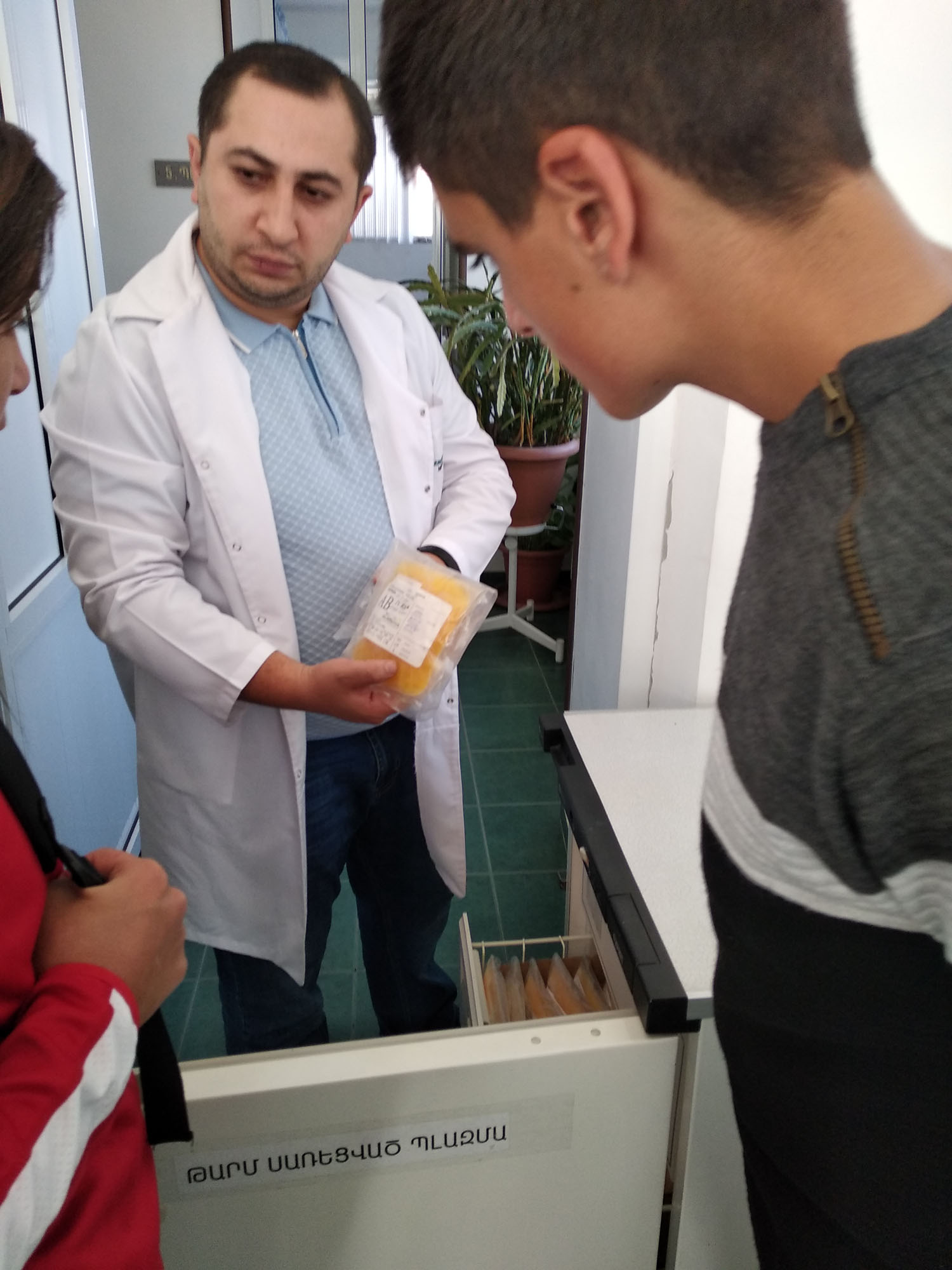 Students witnessed mathematics lecturer R. Petrosyan as a registered volunteer donor, the process of blood transfusion, separation and storage of blood components.