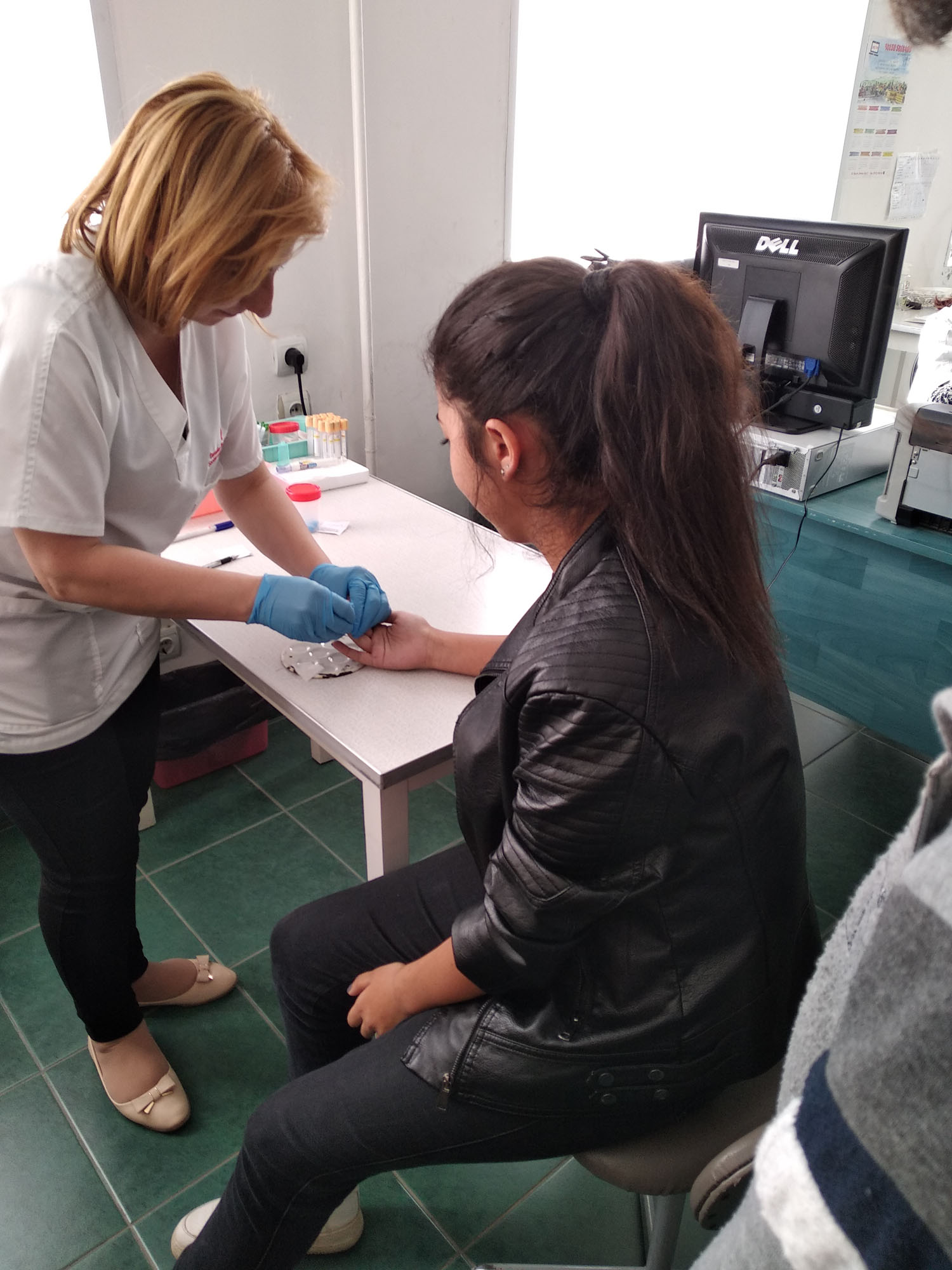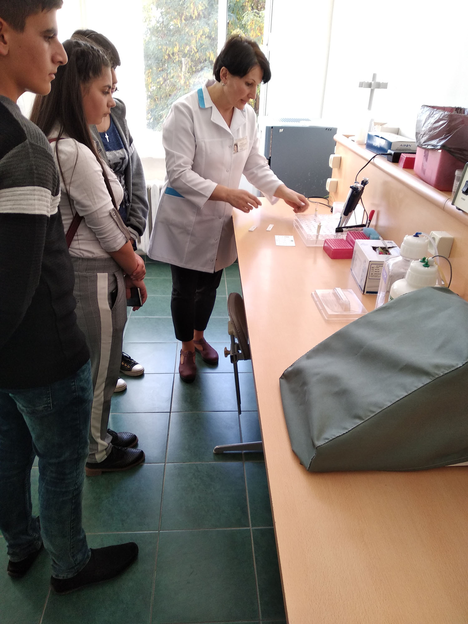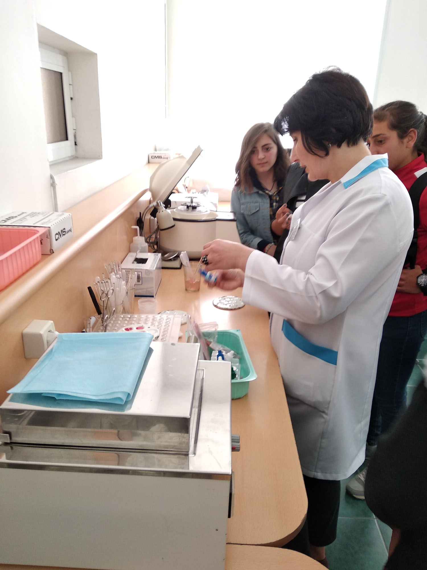 The specialist doctor decided that the blood group of one of the students step by step demonstrating the entire process.