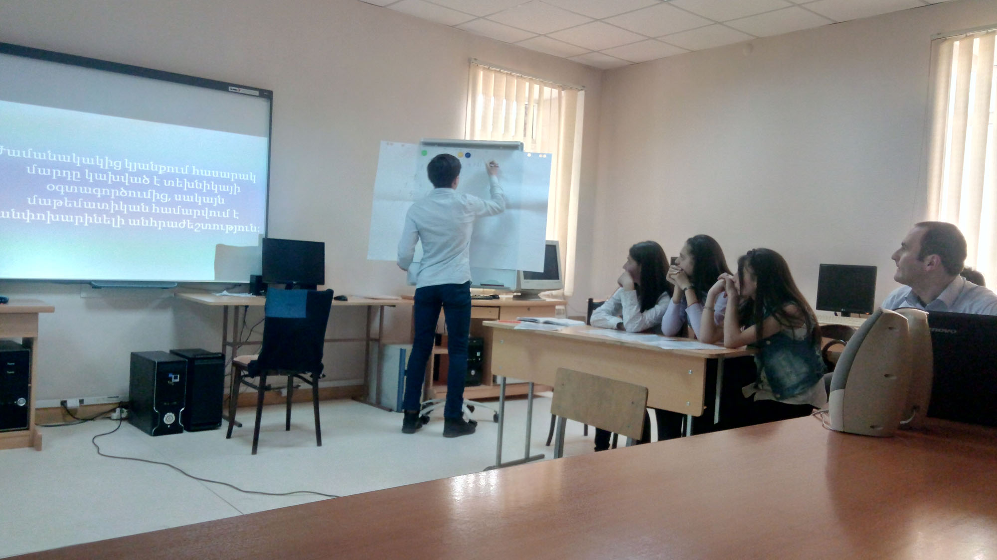 Les élèves ont présenté le rôle des mathématiques dans les différents domaines au moyen d'un diaporama nourri et des vidéos intéressantes: architecture, construction, médecine, industrie, économie, ainsi que dans la vie quotidienne et les affaires. Les mathématiques ont été considérées importantes comme un stimulant pour le développement des capacités mentales de l’homme.