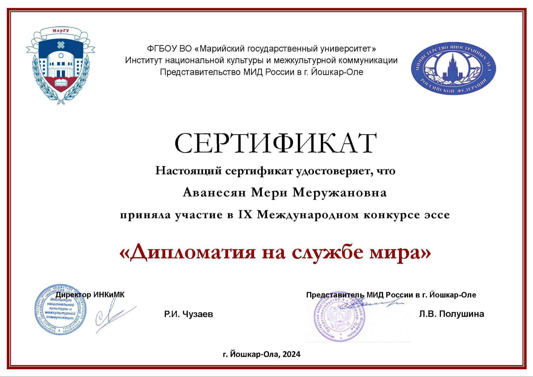 2024թ․ մարտին, Արցախից բռնի տեղահանված, «Համակարգիչների շահագործում» մասնագիտության երկրորդ կուրսի ուսանողուհի Մերի Մերուժանի Ավանեսյանը մասնակցել է «Դիվանագիտություն հանուն խաղաղության» միջոցառումների շրջանակում ՌԴ Մարիի պետական համալսարանի կողմից կազմակերպված շարադրությունների իններորդ միջազգային մրցույթին և ստացել հավաստագիր։