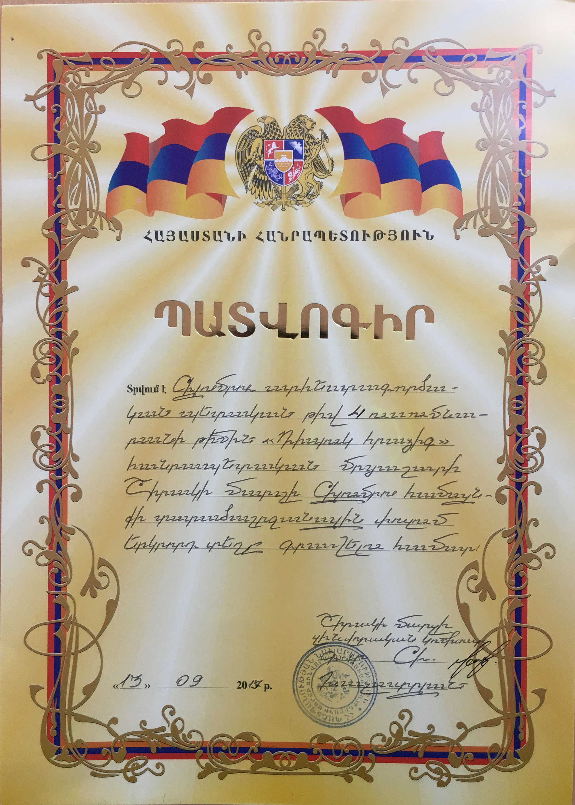 Սույն թվականի սեպտեմբերի 12-ին Գյումրու թիվ 4 արհեստագործական պետական ուսումնարանի հավաքական թիմը մասնակցեց Գյումրու թիվ 23 հիմնական դպրոցում անցկացվող ՀՀ դպրոցականների «Դիպուկահար հրաձիգ-2019» հանրապետական մրցաշարի առաջին փուլի մրցումներին: Թեժ պայքարի արդյունքում պատանի հրաձիգները զբաղեցրին երկրորդ պատվավոր հորիզոնականը և պարգևատրվեցին պատվոգրով: