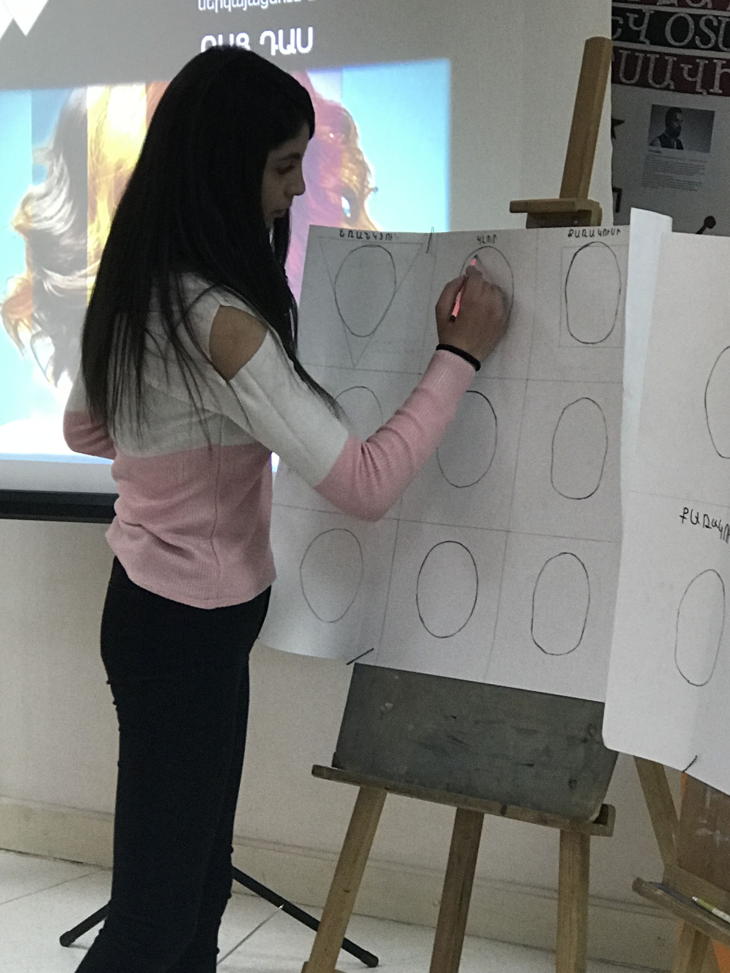 Նախապես էսքիզավորված ցուցապաստառներին ուսանողները գծագրեցին կտրվածքների և ճակատային մազափնջերի տեսասկներն՝ ըստ դեմքի ձևերի: