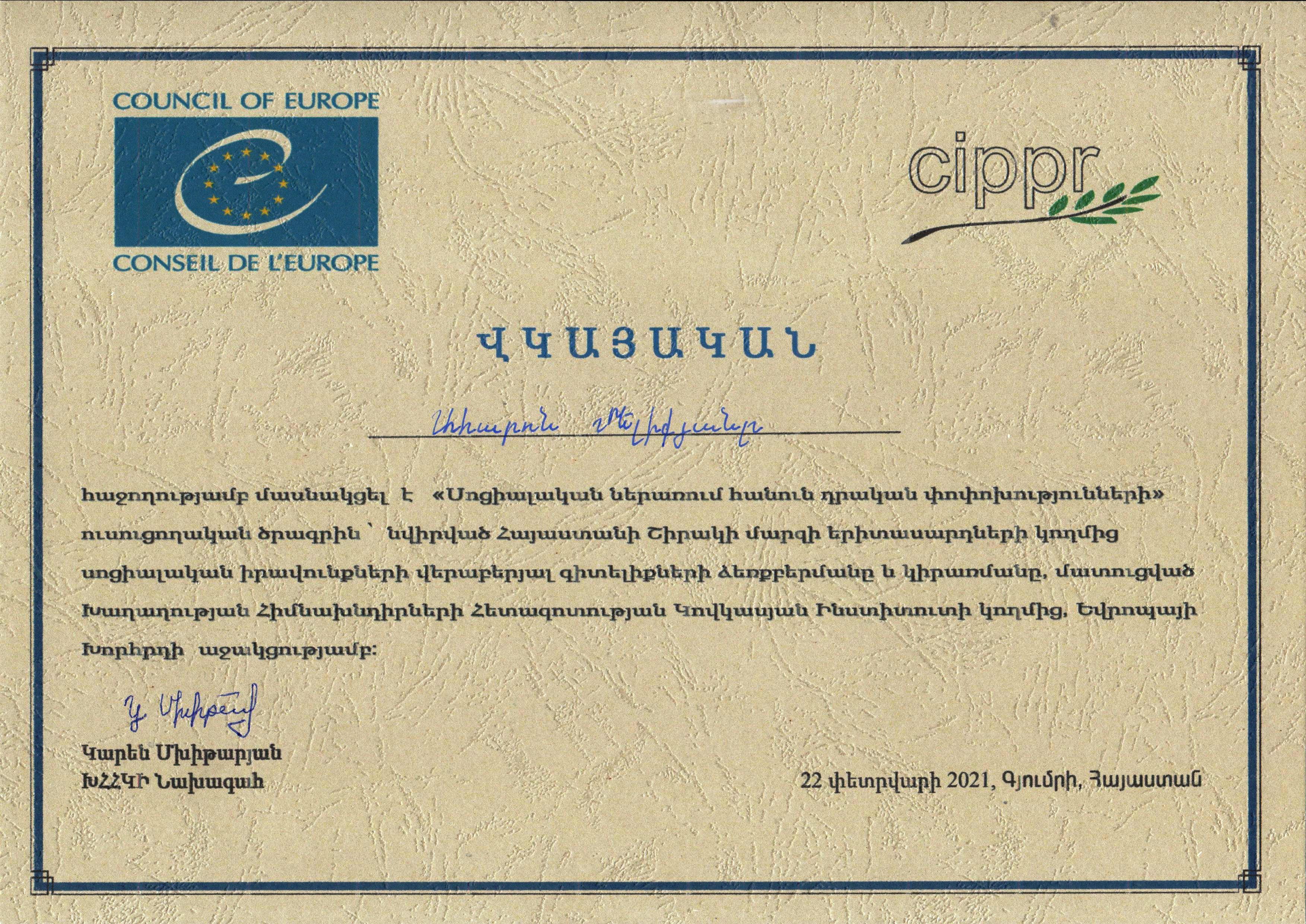 Գյումրու թիվ 4 արհեստագործական պետական ուսումնարանի կարիերայի ուղղորդման կենտրոնի ղեկավար Լևոն Իգիթյանի ուղղորդմամբ «Խոհարարական գործ՝ խոհարար» մասնագիտությամբ 2-րդ կուրսի ուսանողներ Ահարոն Մելիքյանը և Զոհրաբ Գևորգյանը, «Համակարգչային օպերատրություն՝ օպերատր համակարգչի» մասնագիտությամբ 3-րդ կուրսի ուսանողուհի Անուշ Սիմոնյանը, 2021 թվականի փետրվարի 18-21-ը մասնակցեցին «Խաղաղության հիմնախնդիրների հետազոտության կովկասյան ինստիտուտի» կողմից իրականացվող «Սոցիալական ներառում հանուն դրական փոփոխությունների» խորագրով ուսուցողական ծրագրին: Ծրագիրը նվիրված էր Հայաստանի Հանրապետության Շիրակի մարզի երիտասարդների կողմից սոցիալական իրավունքների վերաբերյալ գիտելիքների ձեռքբերմանը և կիրառմանը: